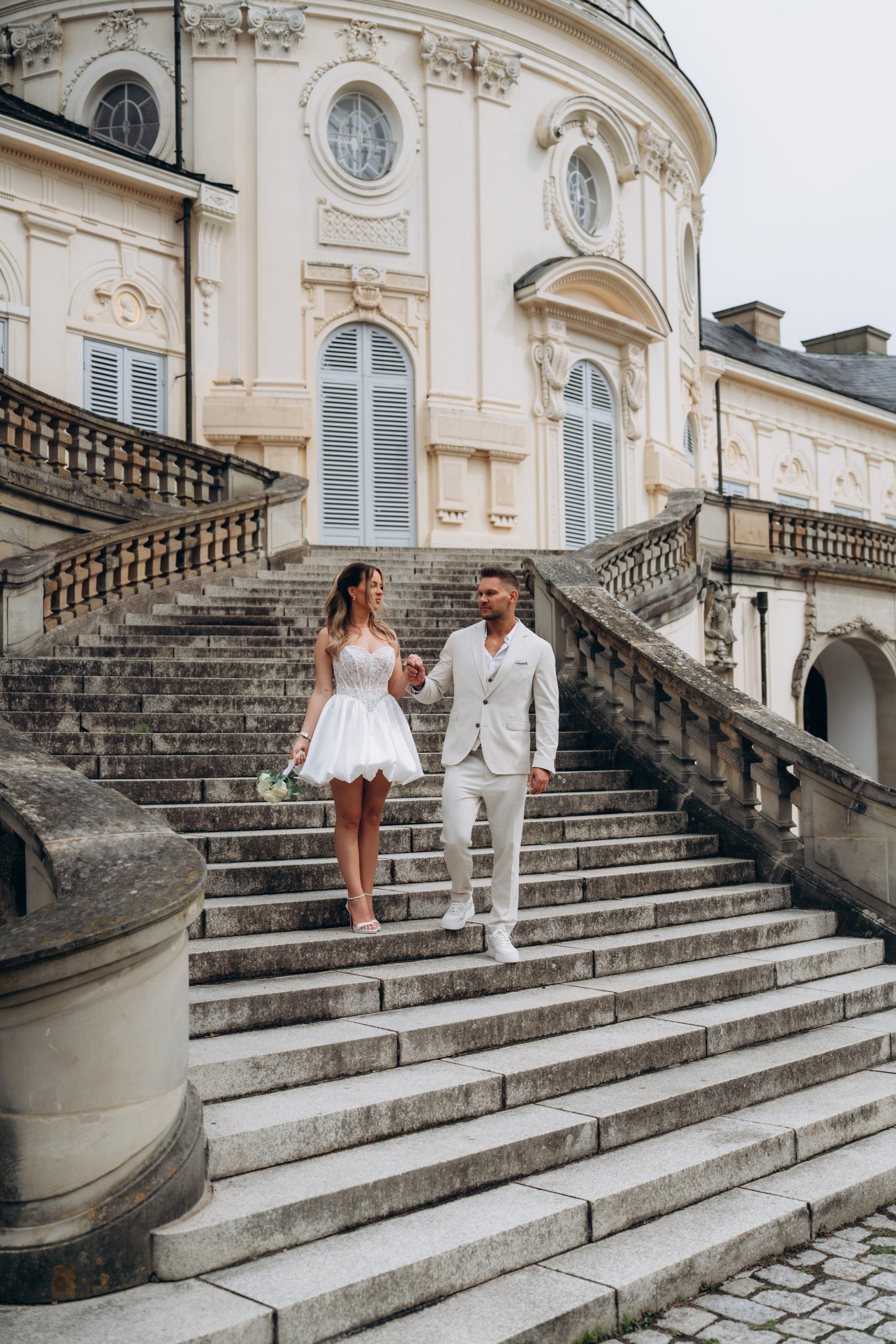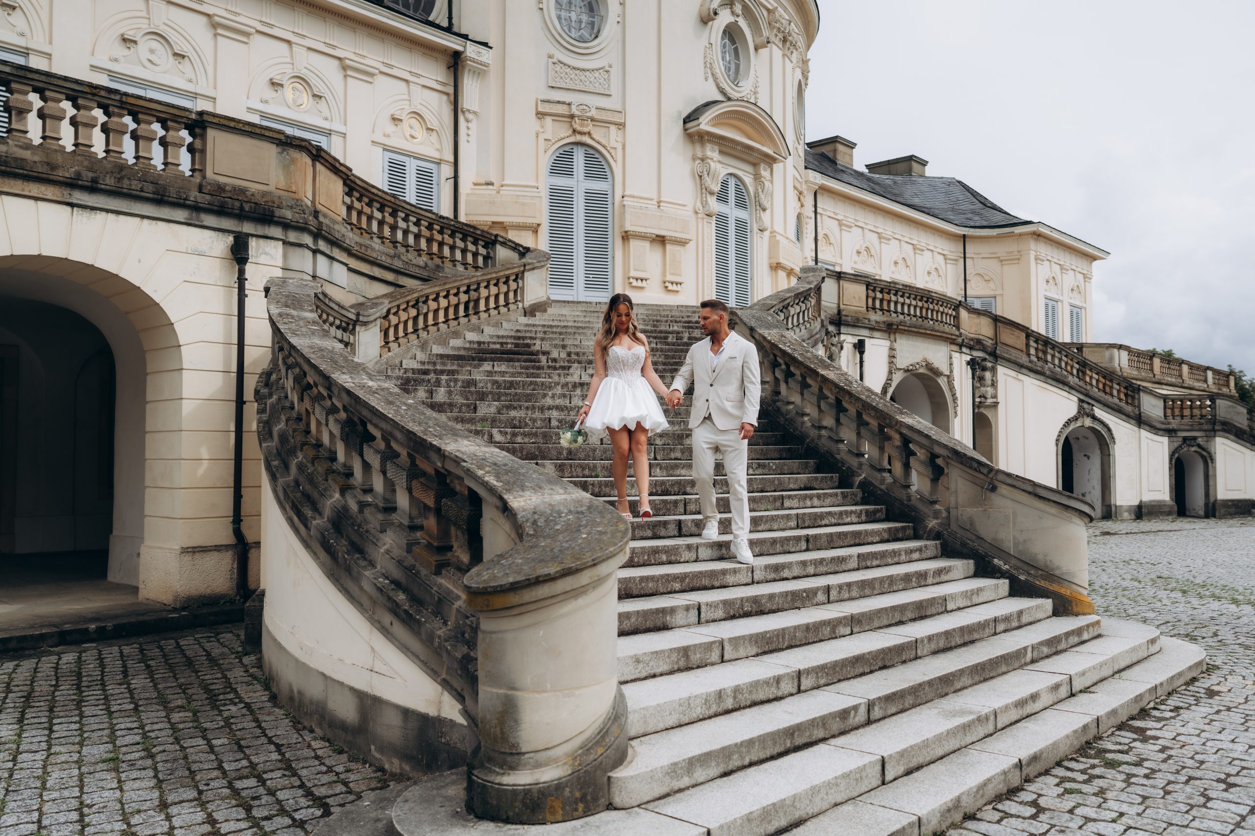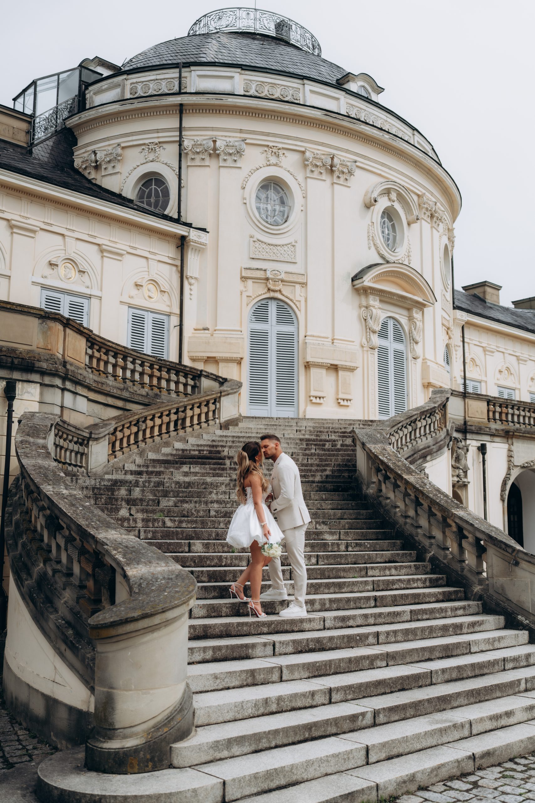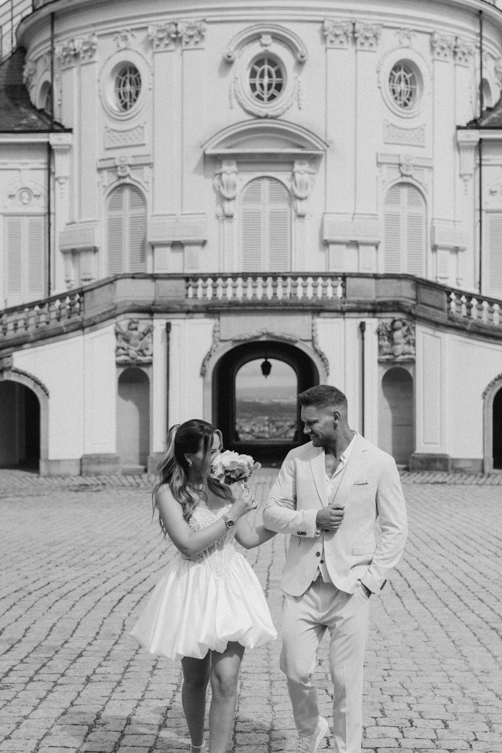 Die klare Fassade, die symmetrischen Treppenanlagen und die offene Aussicht über Stuttgart schaffen ideale Bedingungen für elegante Hochzeitsbilder. Gerade nach einer standesamtlichen Trauung bietet sich das Schloss Solitude als ruhiger und gleichzeitig repräsentativer Ort für Portraits an.