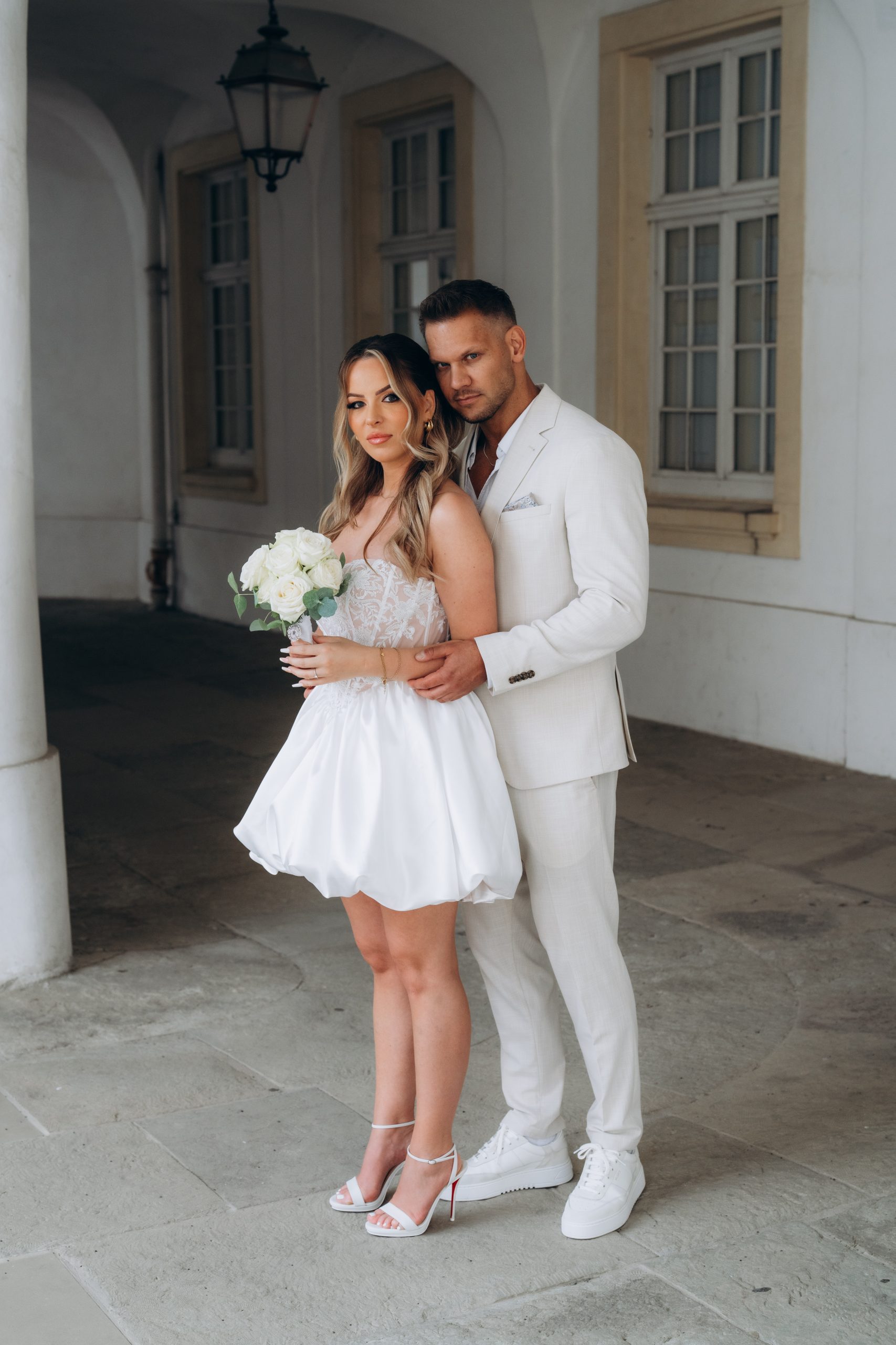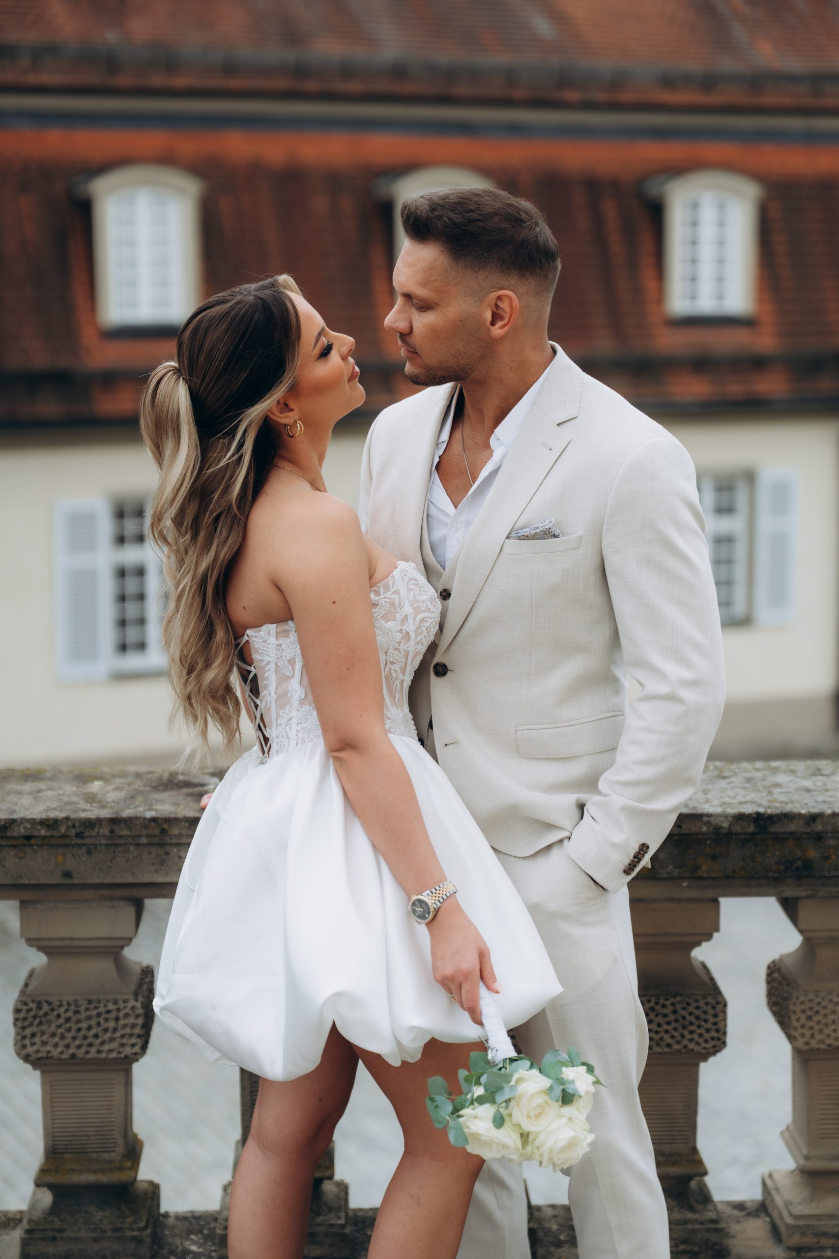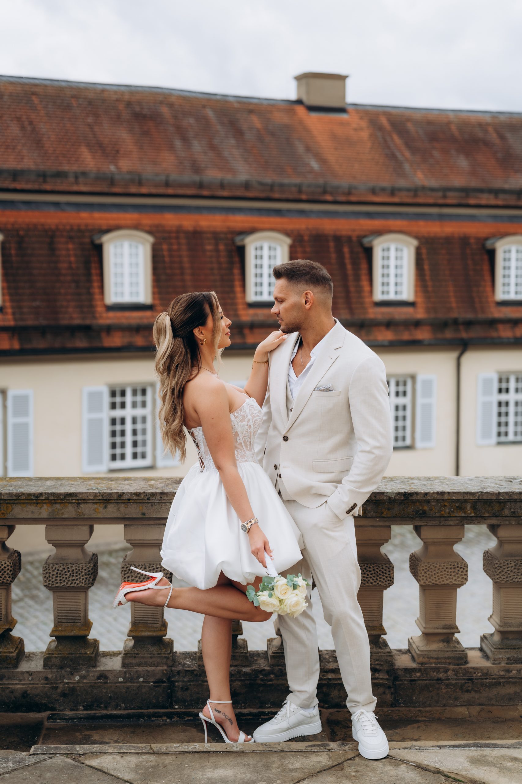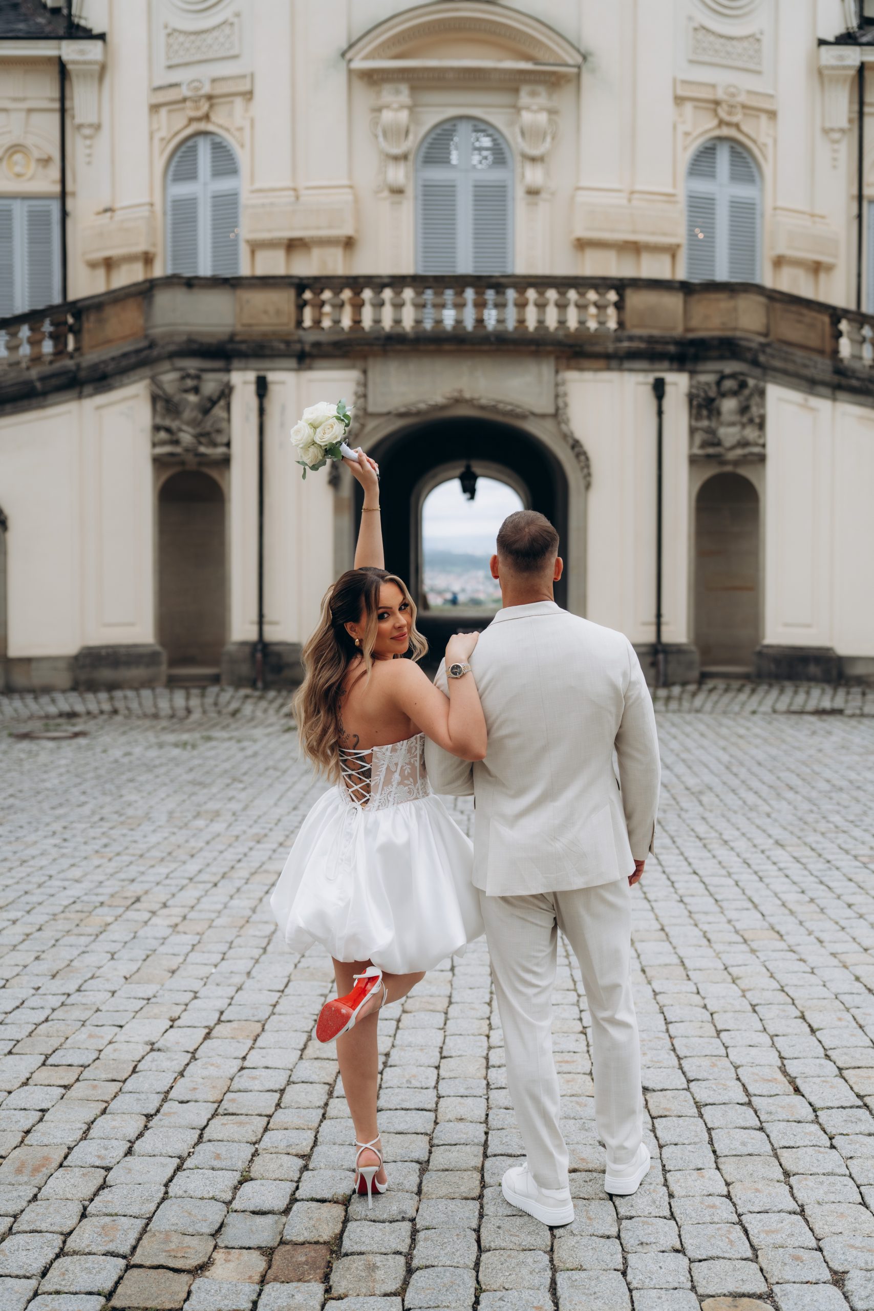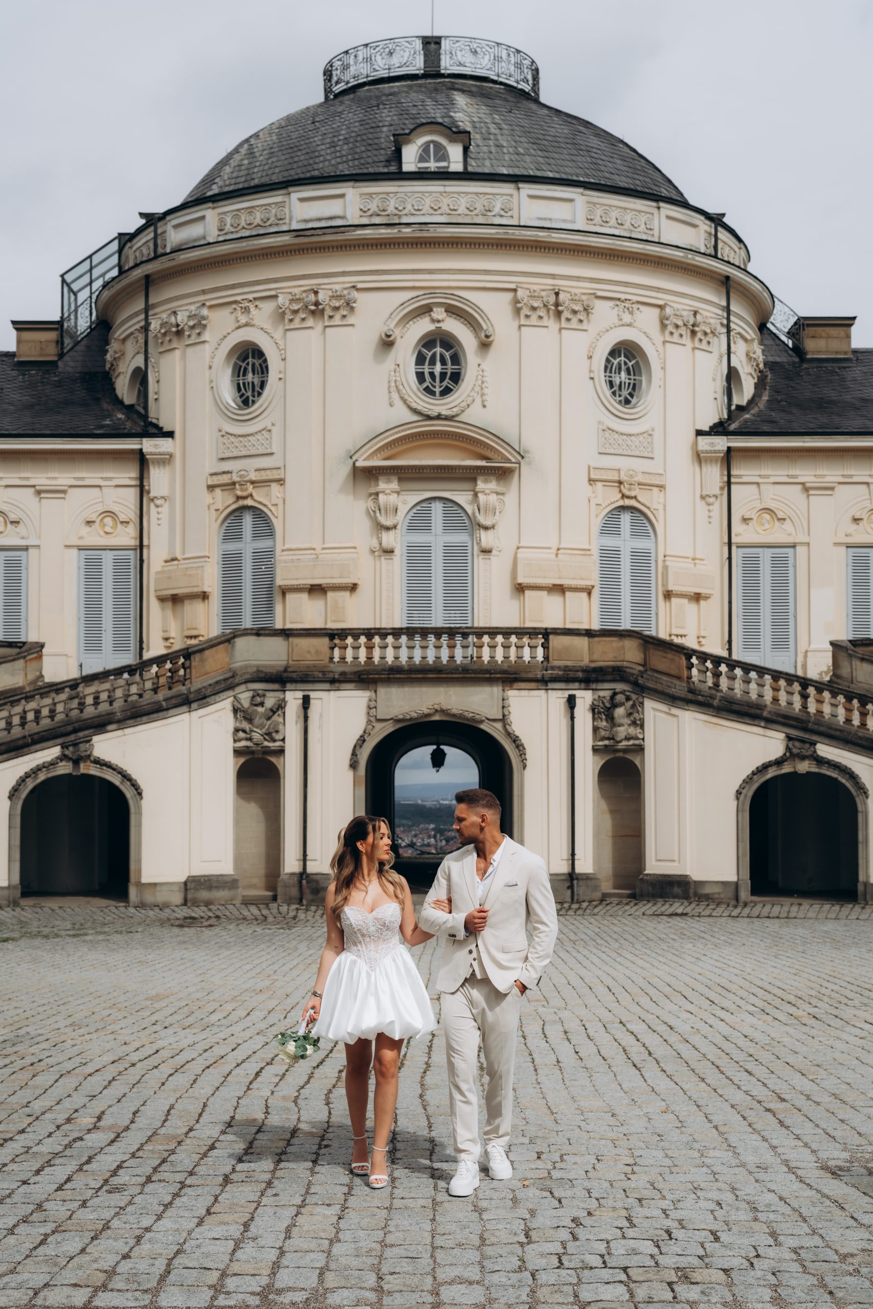 Nach der standesamtlichen Trauung in Leonberg entschieden sich Jaqueline und Julius für ein Brautpaarshooting am Schloss Solitude in Stuttgart. Die barocke Schlossanlage oberhalb der Stadt zählt zu den bekanntesten Fotolocations in Baden-Württemberg und bietet eine beeindruckende Kombination aus Architektur und Weitblick.