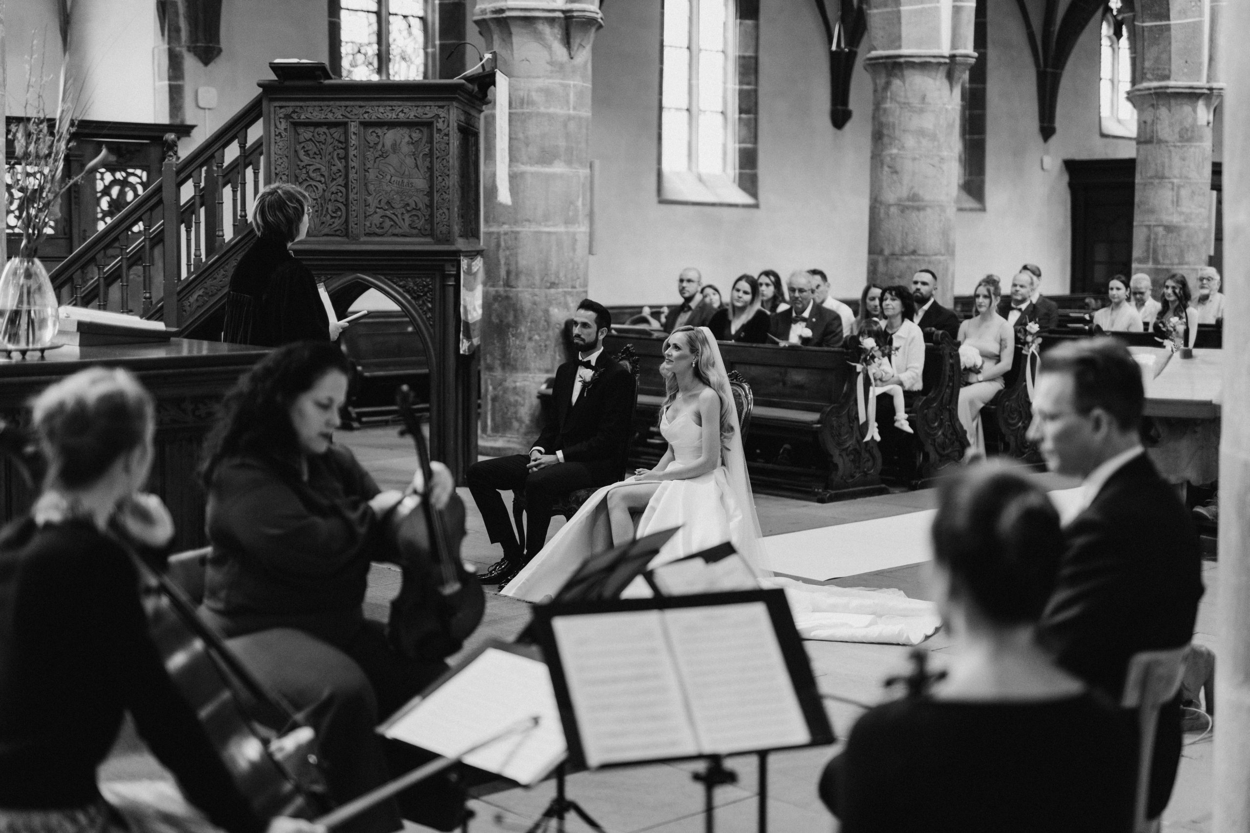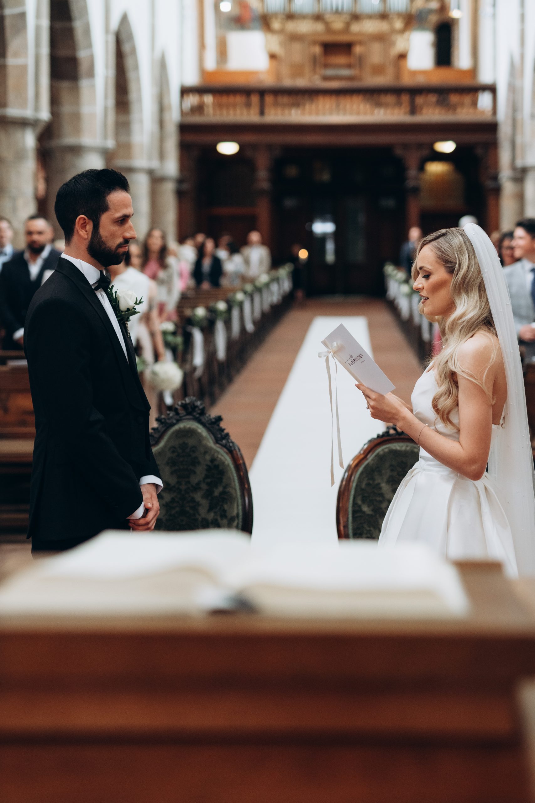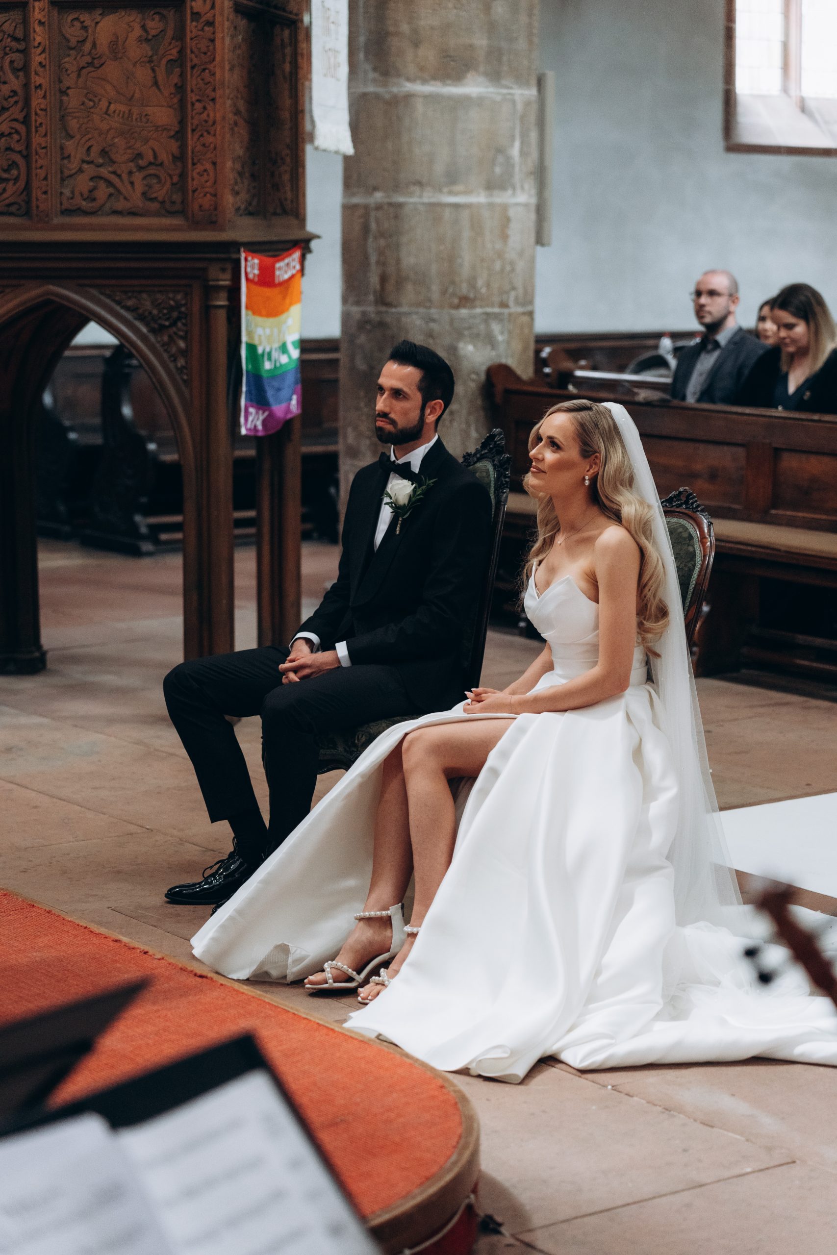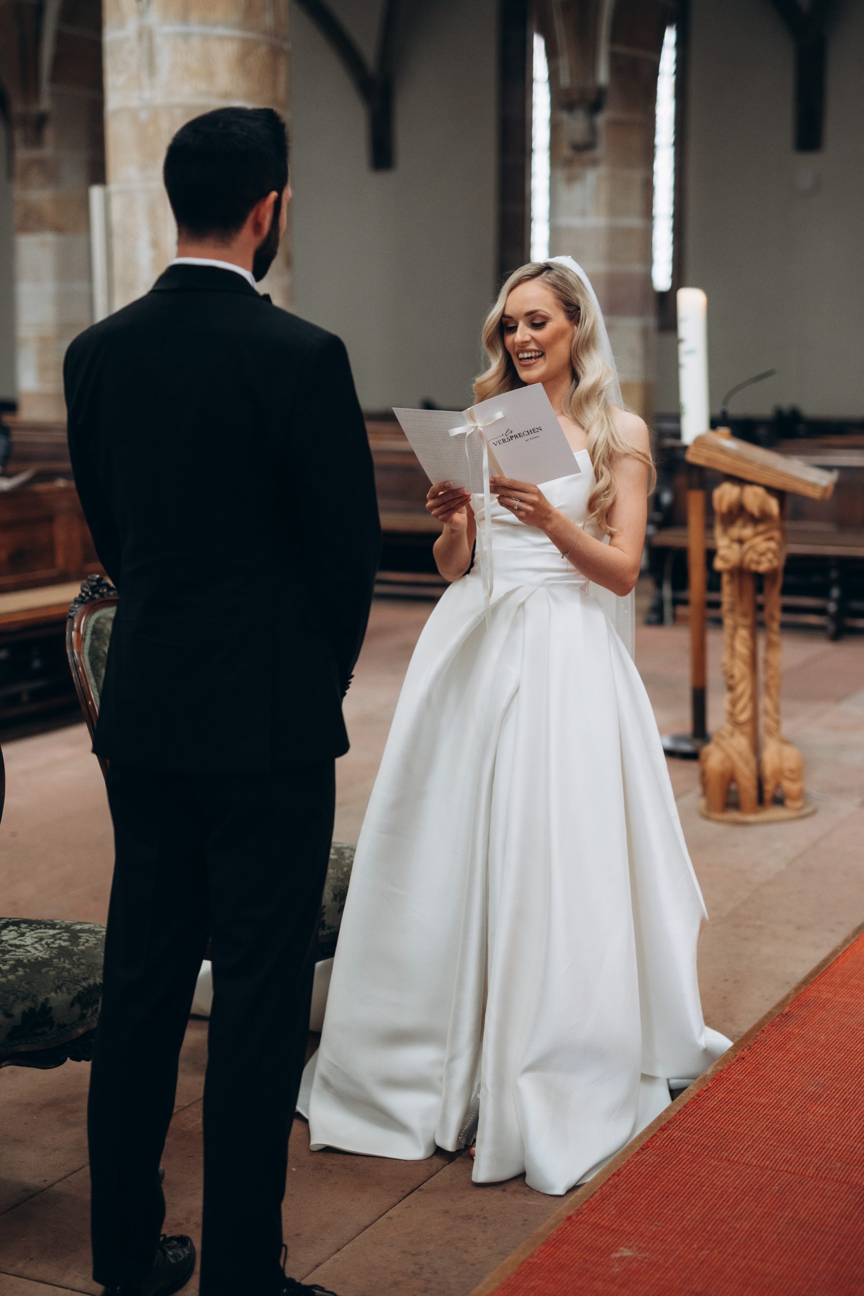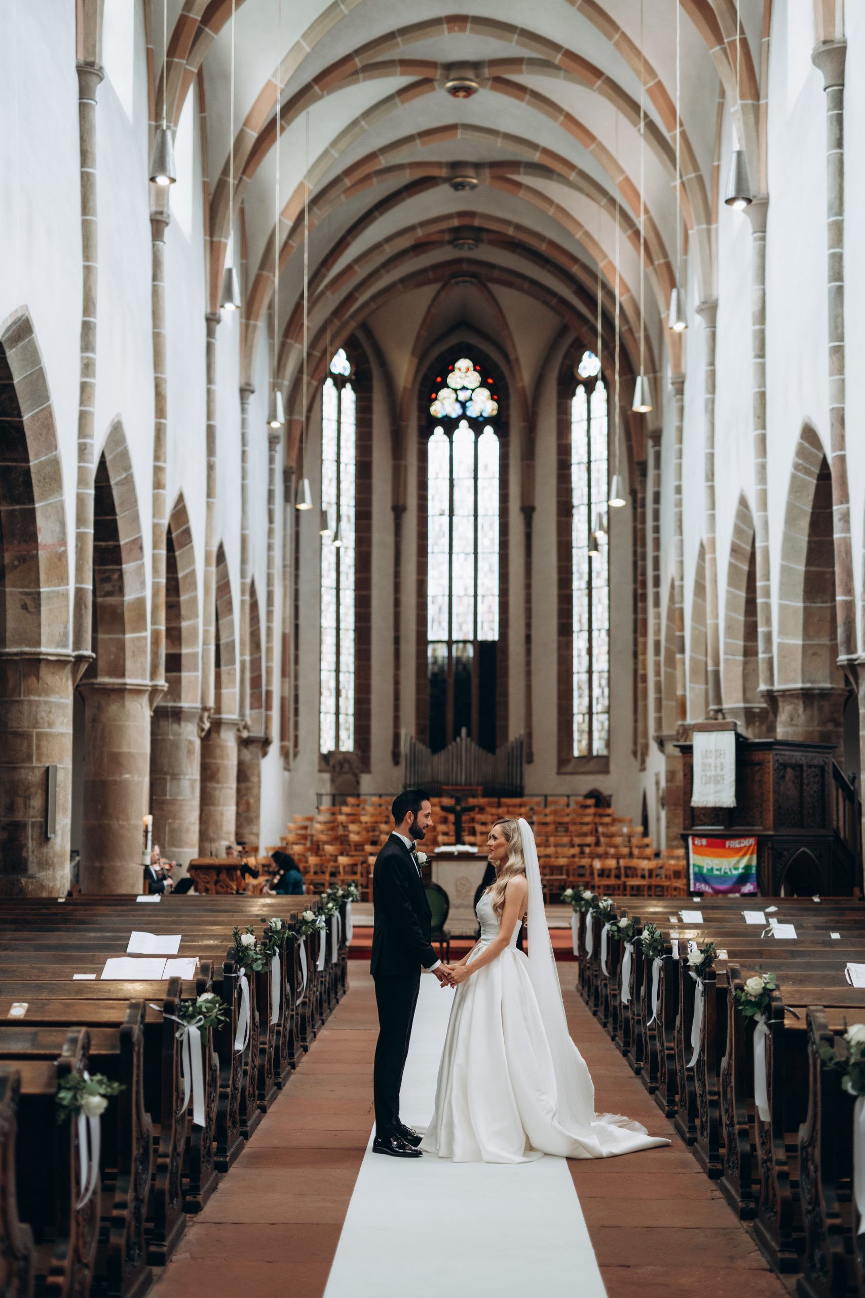 Von dort ging es weiter zur Stiftskirche in Landau. Die kirchliche Trauung war klassisch, emotional und voller echter Momente. Zwischen hohen Mauern und festlicher Atmosphäre gaben sich die beiden ihr Ja-Wort – begleitet von Familie und engen Freunden.