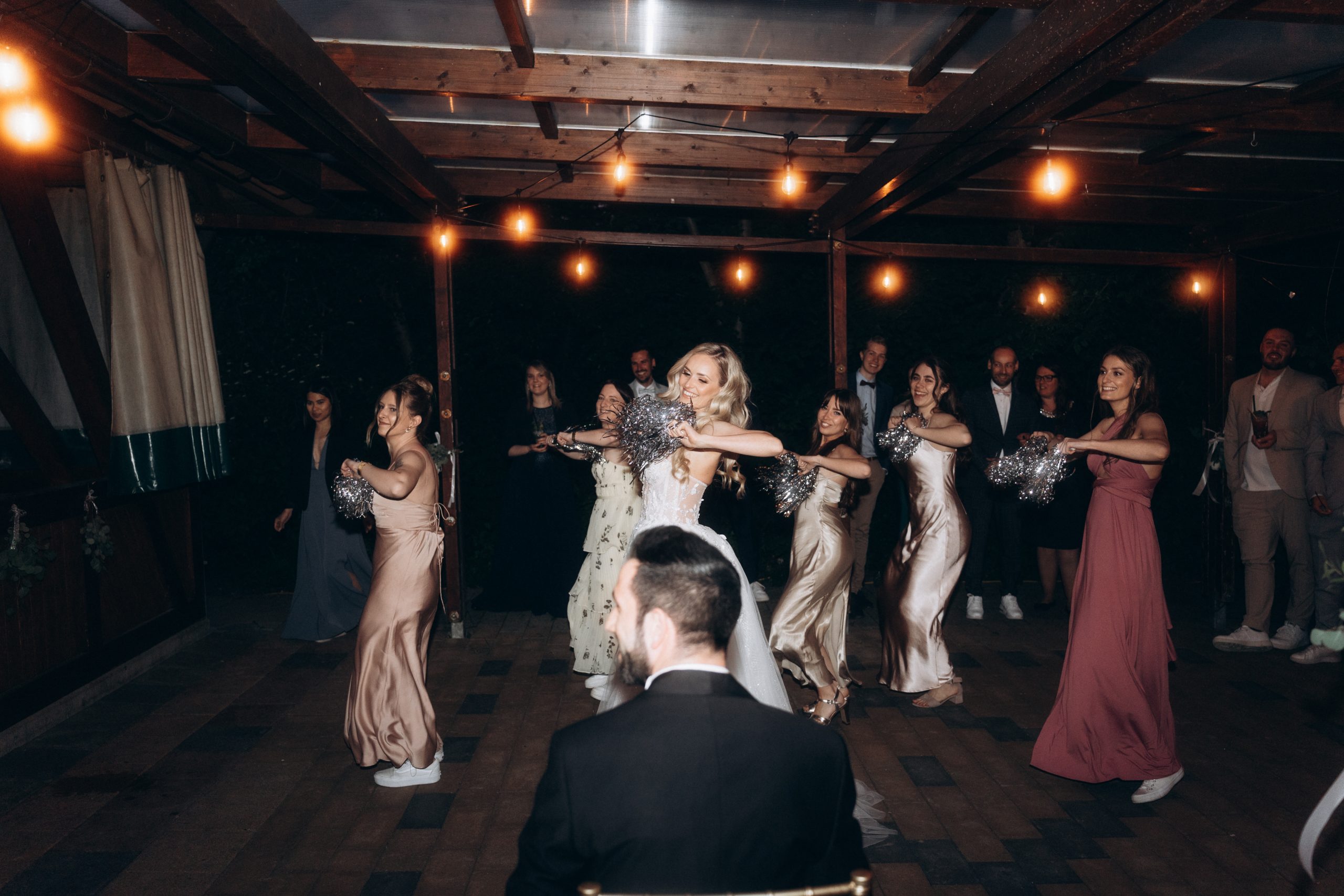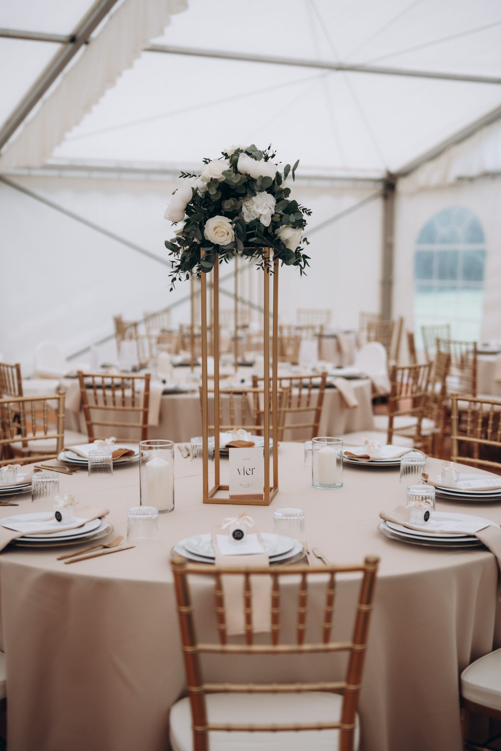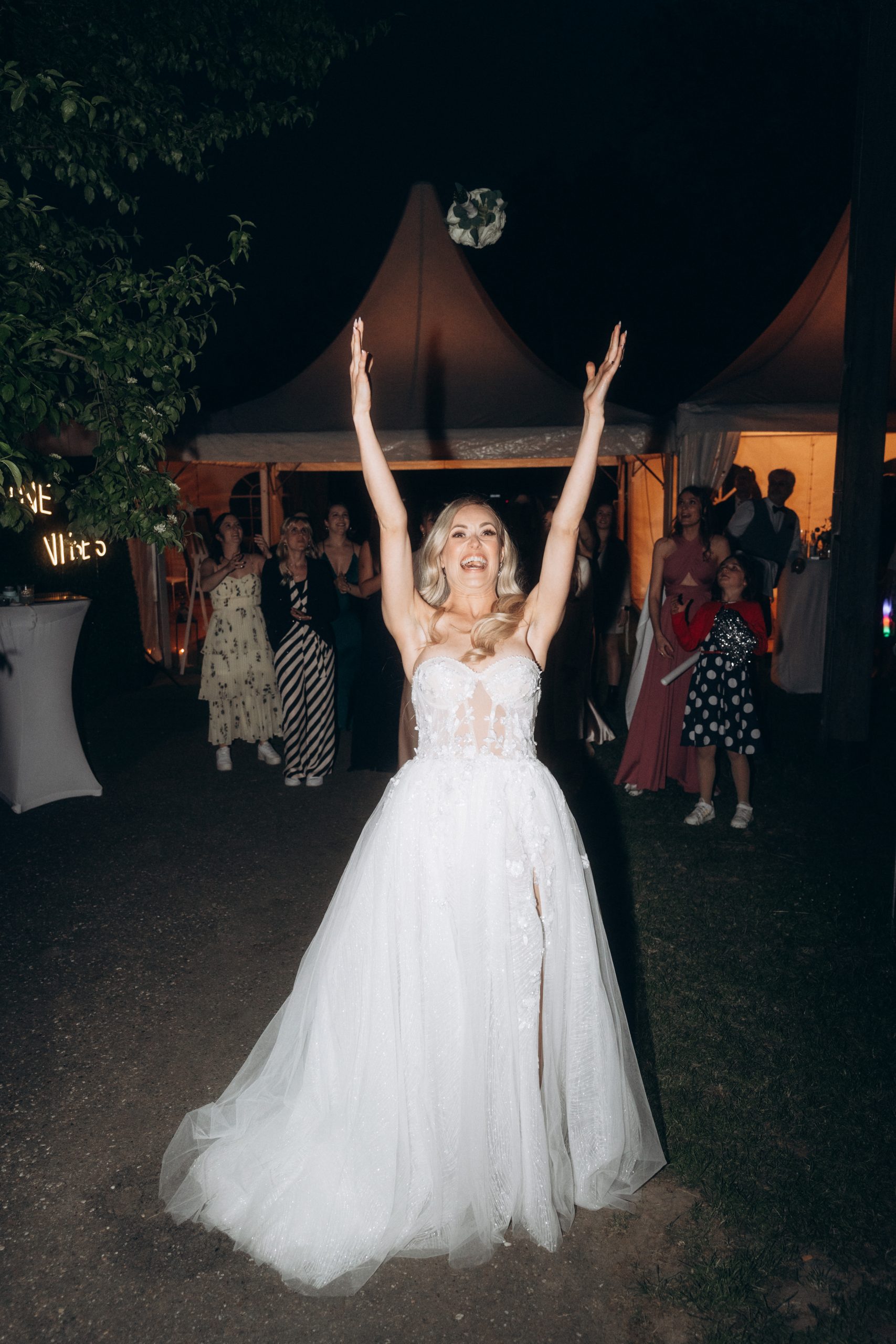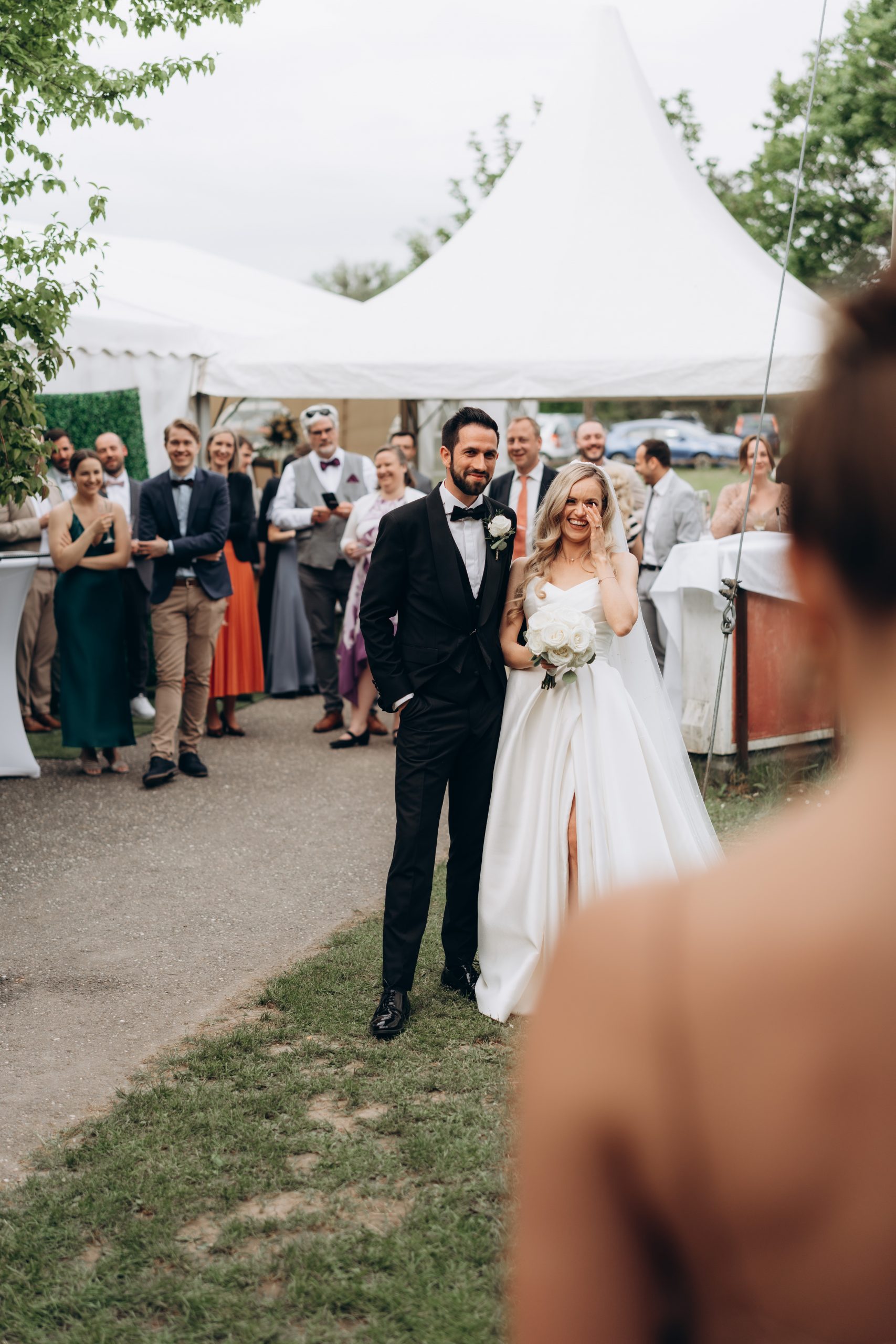 Nach der Zeremonie verlagerte sich der Tag nach Neuburg am Rhein. Dort hatten Franziska & Thomas auf einem privaten Grundstück ein liebevoll dekoriertes Partyzelt aufgebaut. Statt klassischer Eventlocation entschieden sie sich für eine Feier im Freien – persönlich, individuell und genau nach ihren Vorstellungen.