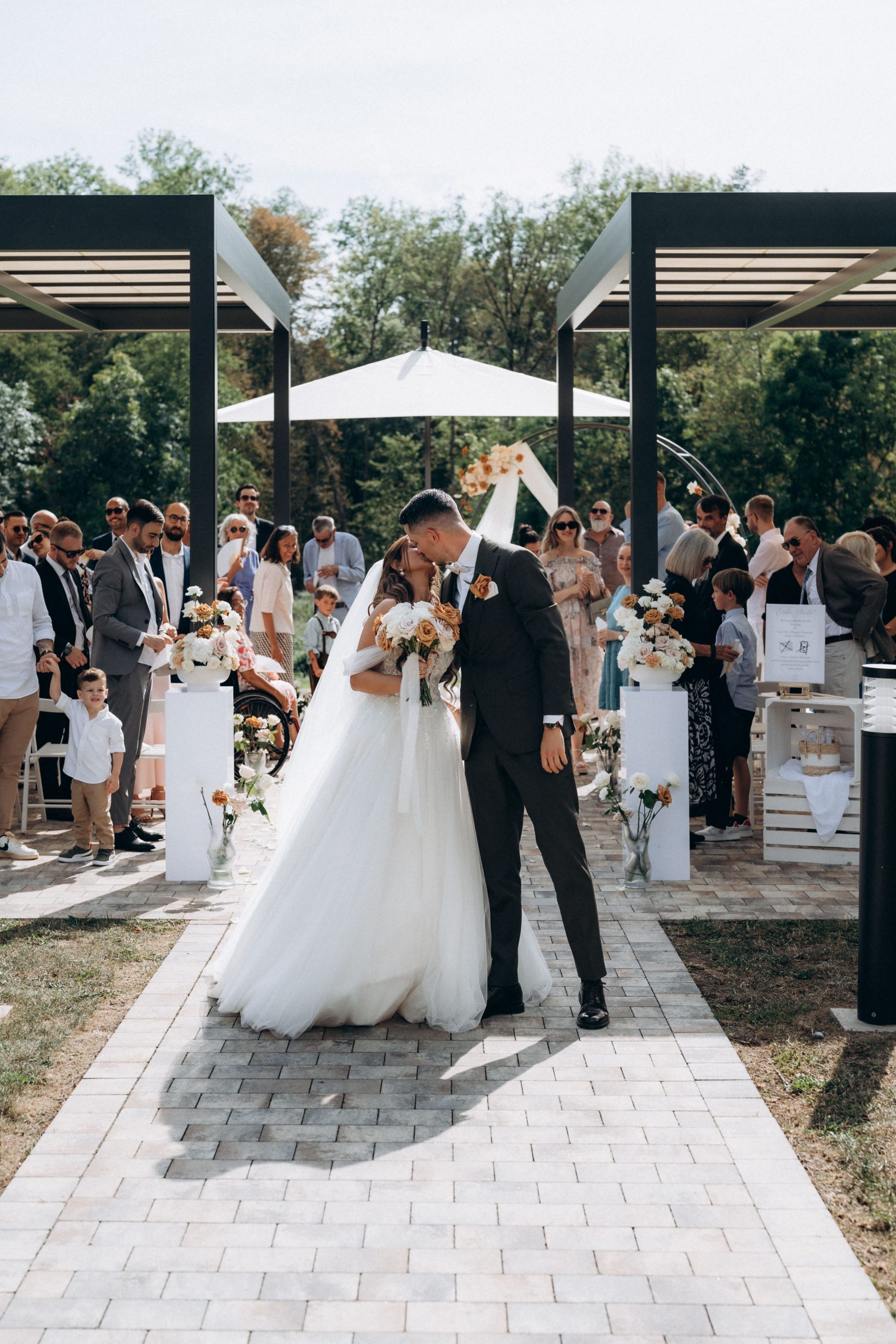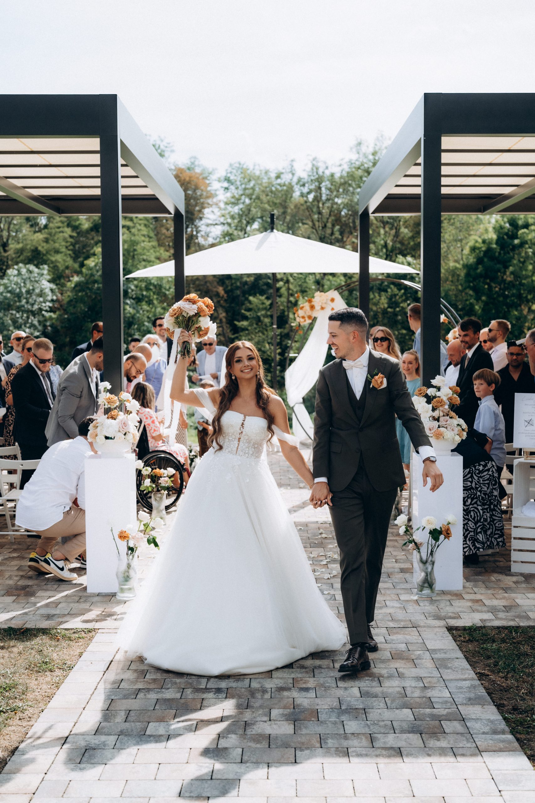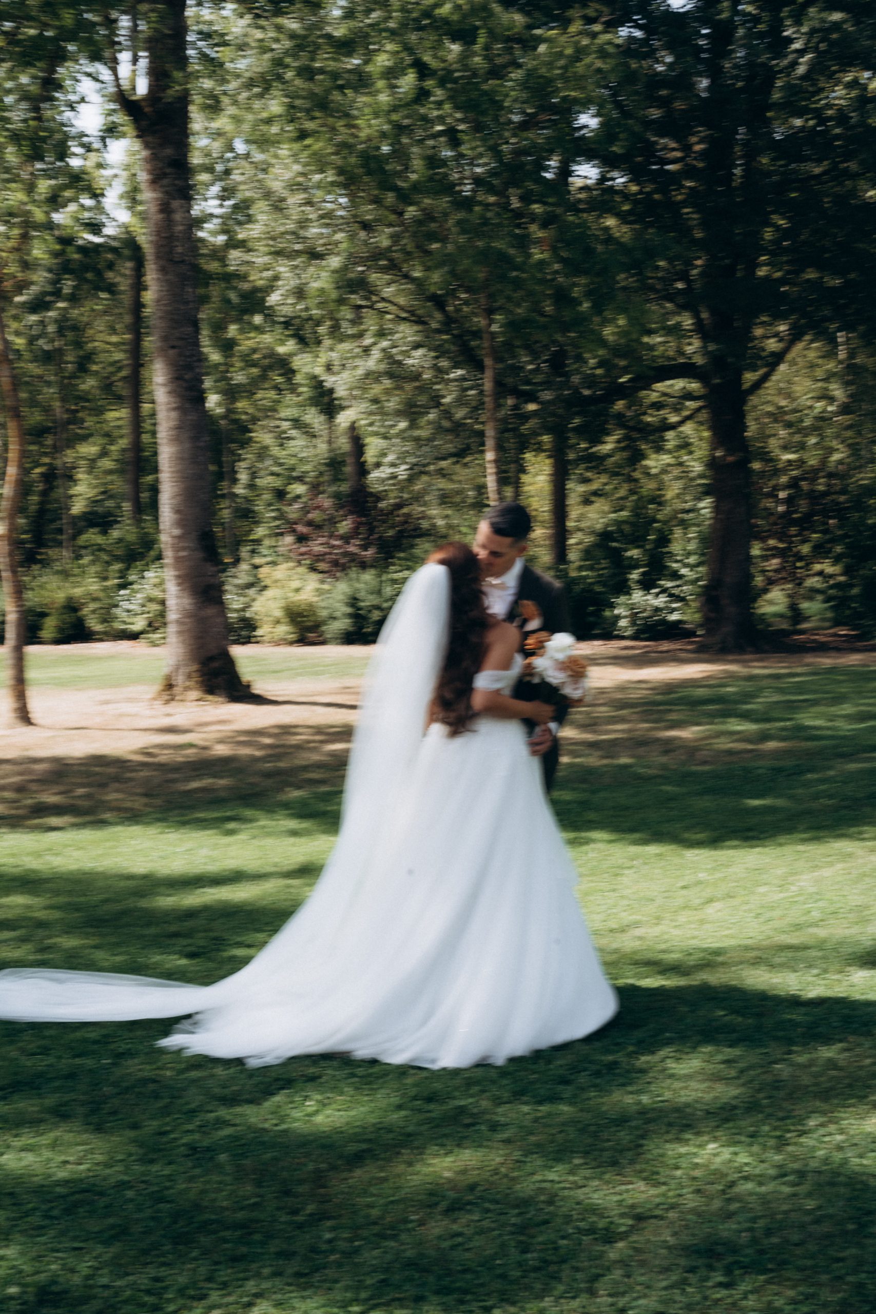 Der Tag begann mit einem First Look in ruhiger Umgebung, bevor die freie Trauung im Außenbereich stattfand. Umgeben von der weitläufigen Gartenanlage und dem besonderen Charakter des Anwesens entstand eine persönliche und emotionale Zeremonie.