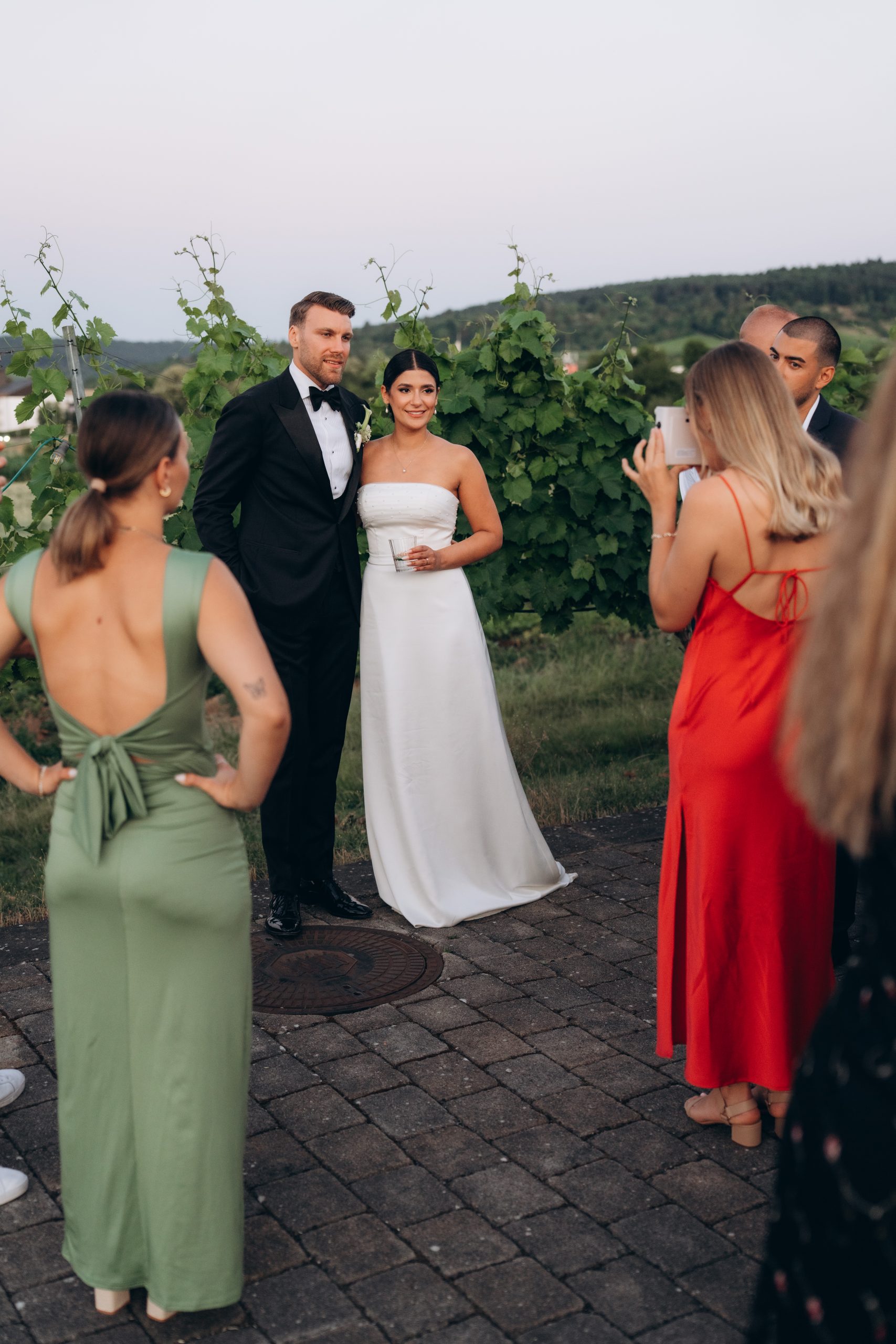 Für das Brautpaarshooting nutzten wir die umliegenden Weinberge. Das natürliche Licht und die Struktur der Reben sorgen für eine ruhige Bildsprache. Keine überladenen Hintergründe, sondern klare Linien und warme Farben.