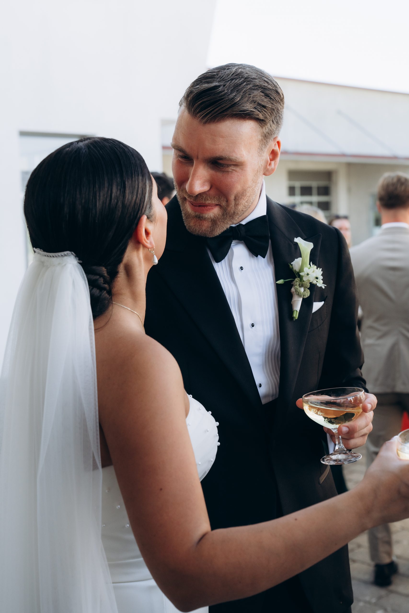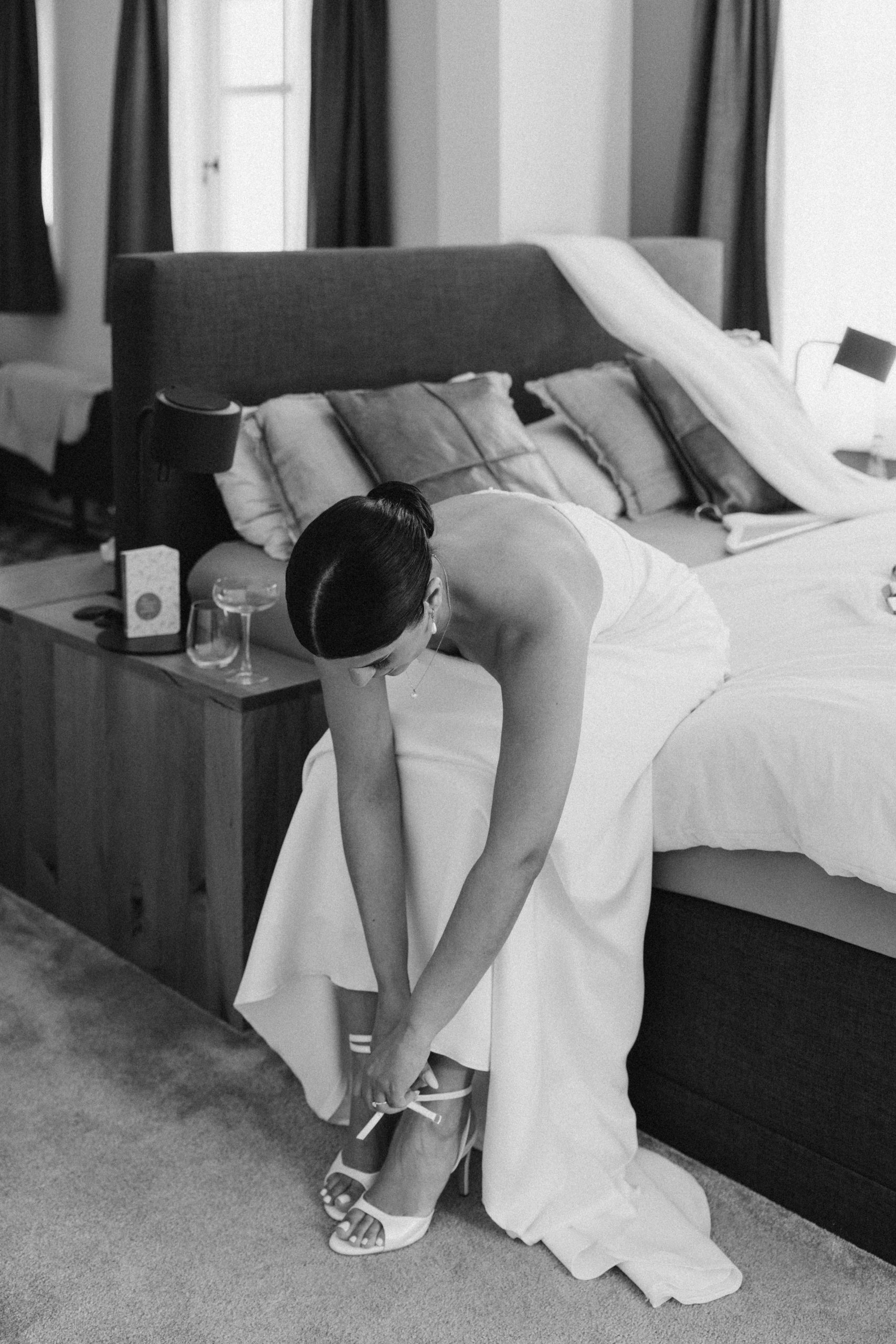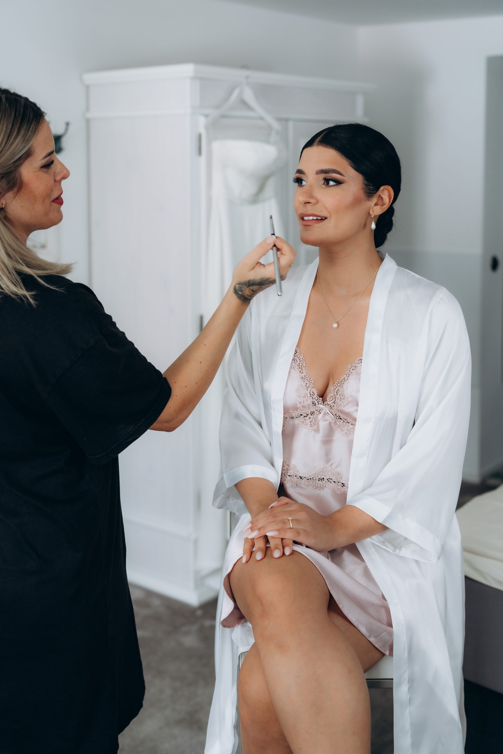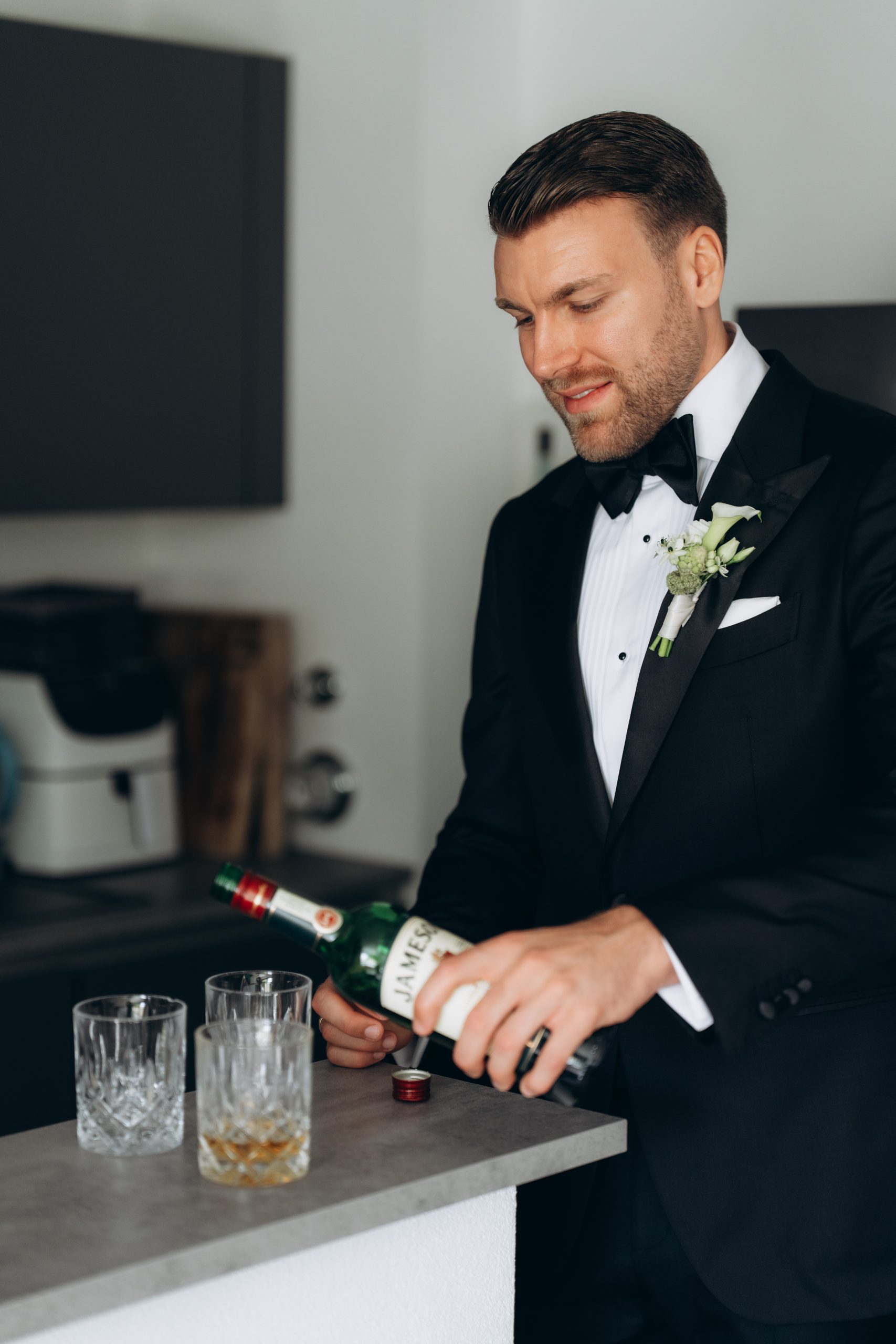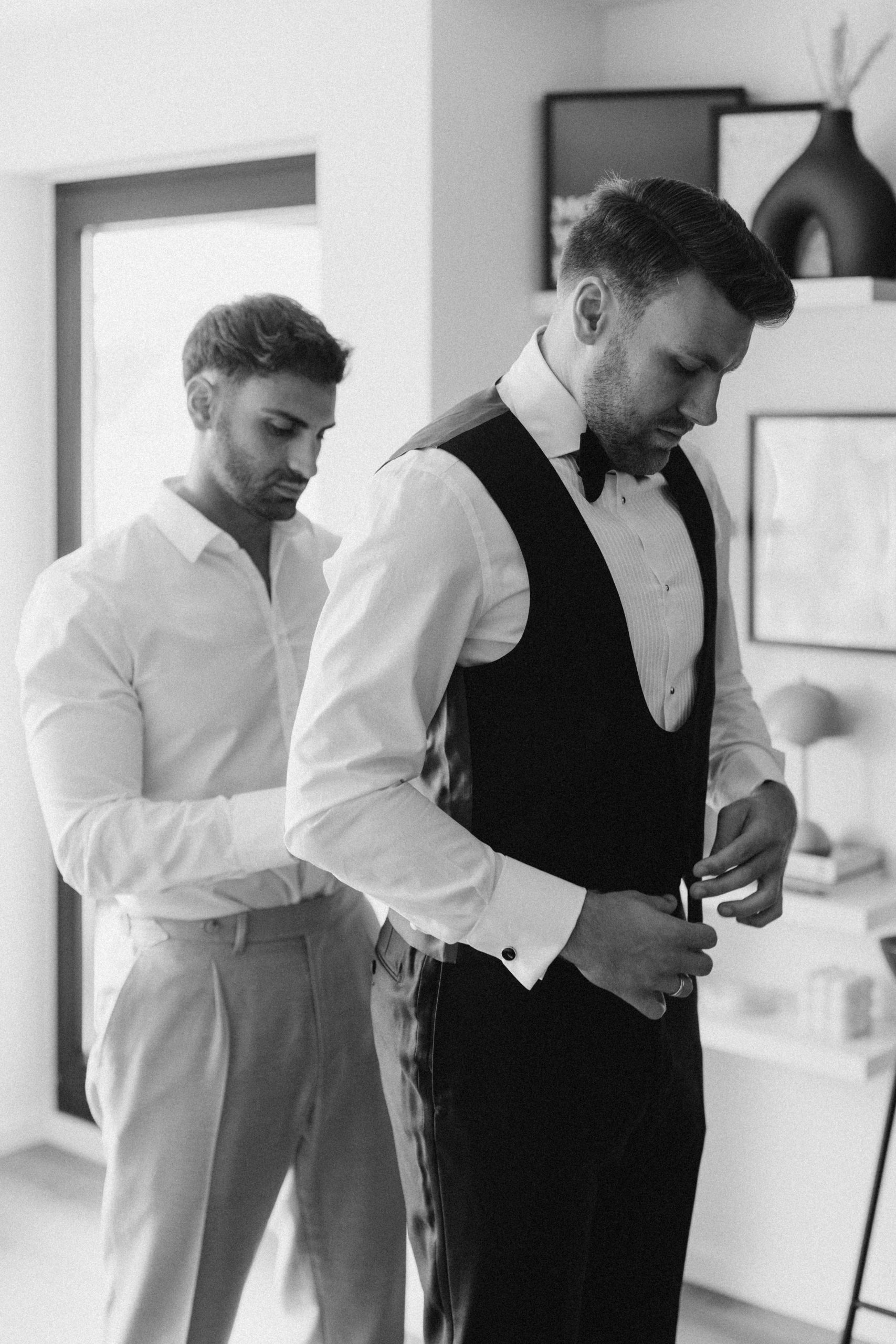 Der Tag begann getrennt. Während Marcel sich in entspannter Atmosphäre vorbereitete, entstanden natürliche Momentaufnahmen und stilvolle Detailbilder von Anzug und Accessoires. Anschließend ging es weiter zu Alena ins Hotel, wo Kleid, Schmuck und letzte Handgriffe dokumentiert wurden.