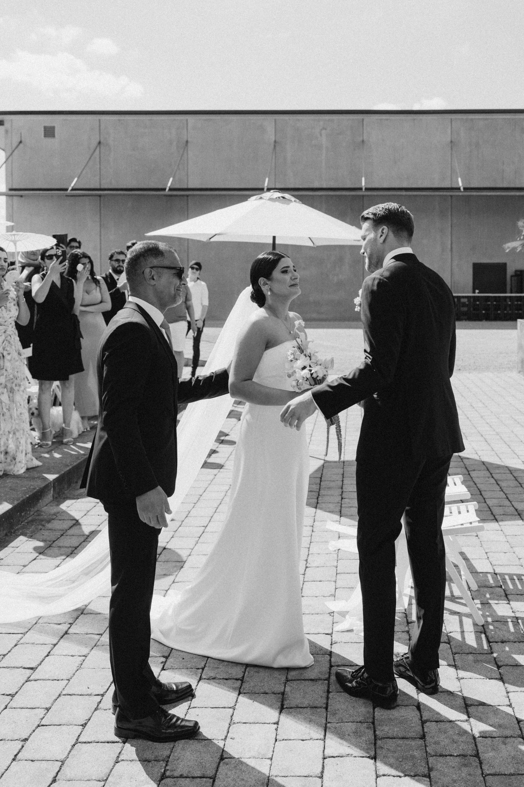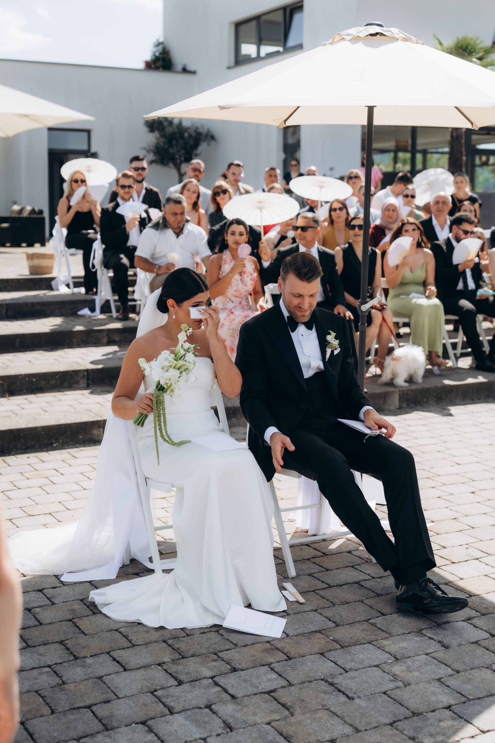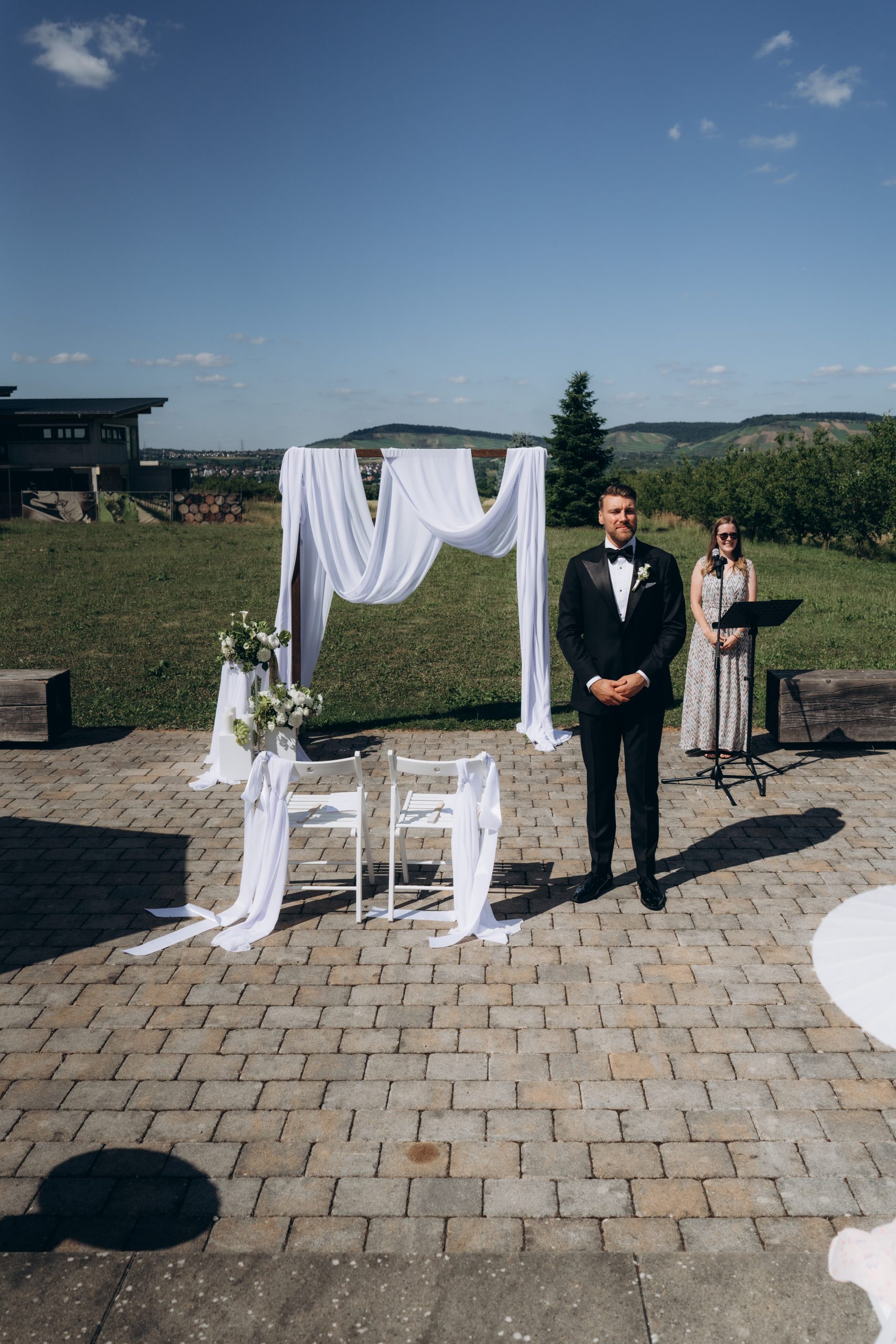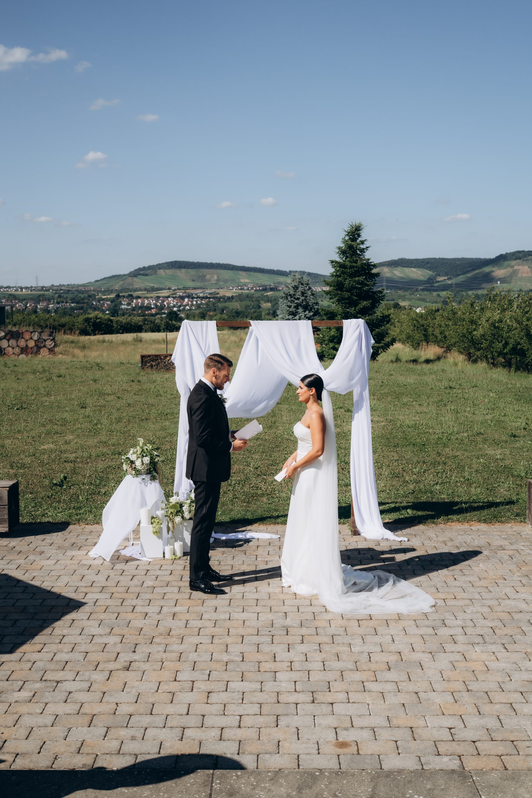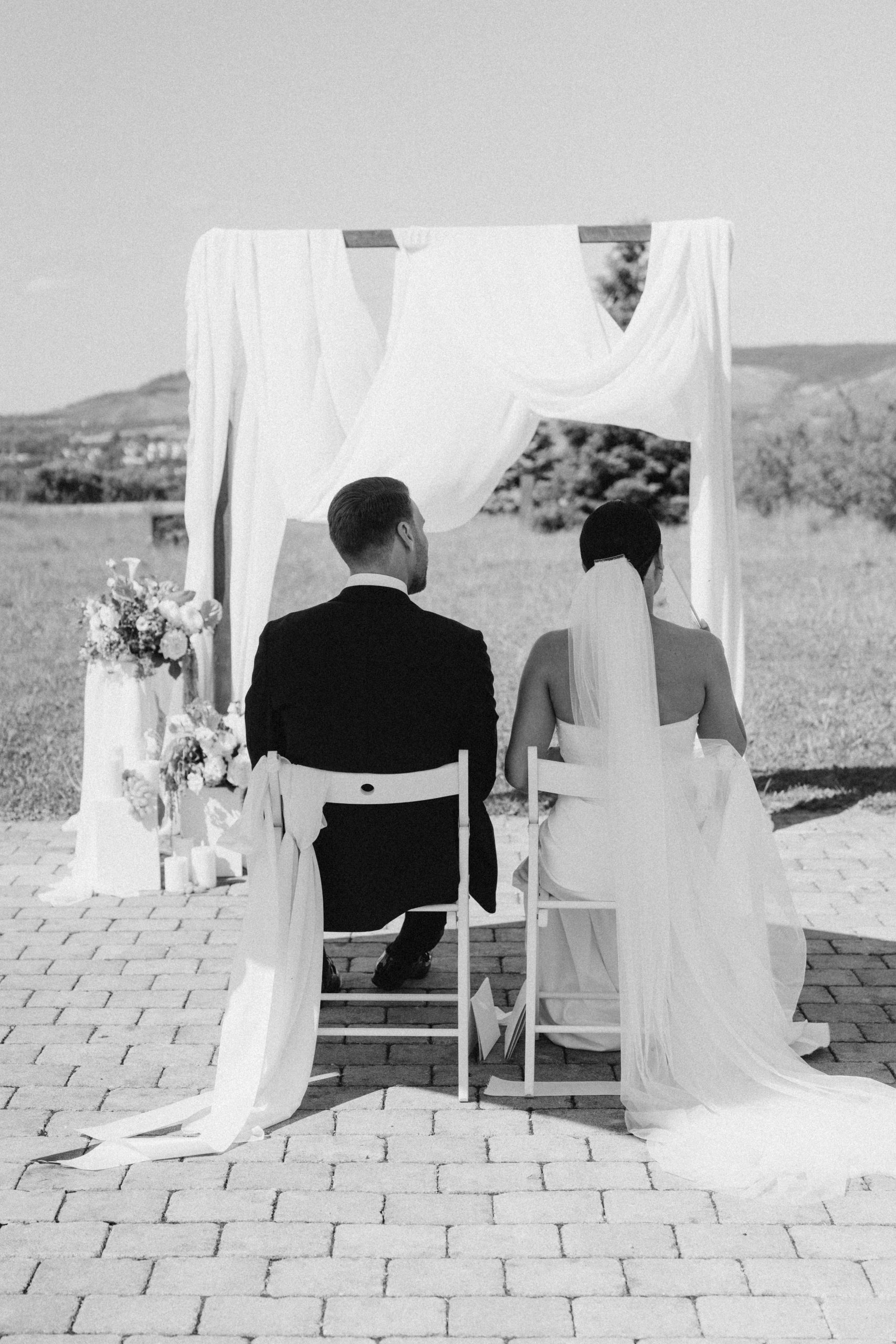 Die freie Trauung war eine Mischung aus Emotion und Leichtigkeit. Der Einzug der Braut mit ihrem Vater setzte einen klassischen, bewegenden Auftakt. Zwischen Lachen und Tränen entstand eine lebendige Zeremonie, die perfekt zur Atmosphäre des Weingut Konzmann passte.