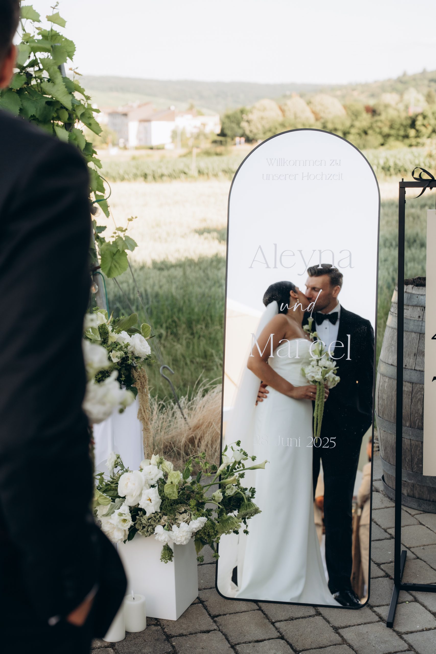 Im Weingut Konzmann in Kernen blieb vor der Ankunft des Brautpaares ein kurzer Moment, um die Dekoration festzuhalten. Klare Linien, elegante Tischgestaltung und die moderne Architektur schaffen hier eine hochwertige, stilvolle Atmosphäre – perfekt für Paare, die eine Hochzeit im Remstal mit ästhetischem Anspruch planen.